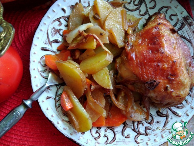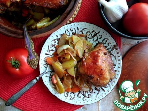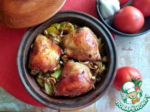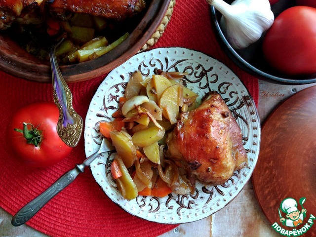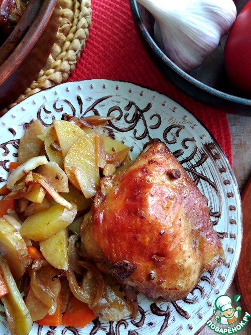 Маринованные бёдра в соевом соусе с чесноком и луком, запечённые с овощами и репой в глиняной посуде. Красиво и очень вкусно, полезно.