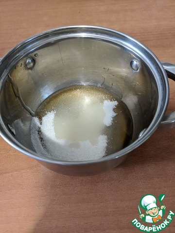 Перемешать мёд, сахар, масло растительное и горячую воду. Поставить на огонь. Когда смесь закипит, снять с огня.