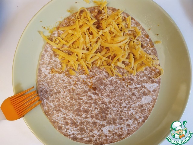 Перевернуть. На половину выкласть натёртый сыр.