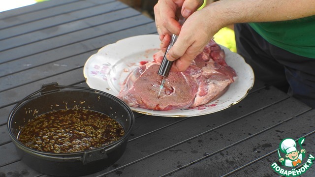 Когда маринад остынет, набрать в шприц жидкость от него и впрыснуть в мясо с обеих сторон.