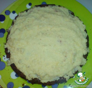 Густым слоем покрываем верх торта и тонким смазываем бока. Пока бока не застыли, обсыпаем их бисквитной крошкой (от обрезков коржей). -