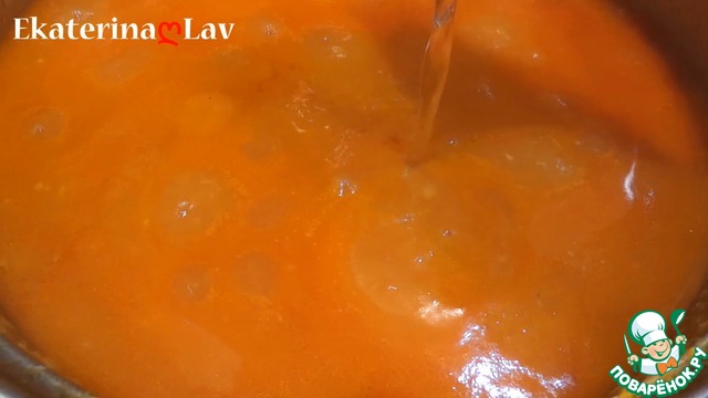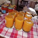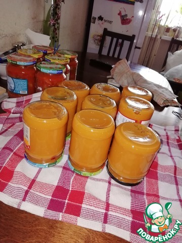 Снимаю с огня и сразу же раскладываю по простерилизованным банкам, закручиваю стерильными крышками. Далее банки переворачиваю кверху дном и укутываю до полного остывания.