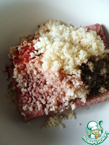 Смешать фарш с булгуром, мелко нарезаным чесноком, взять 2 дольки, одну сохранить для соуса, солью, чёрным и красным перцем. Добавить сухую мяту и наршараб по вкусу. -