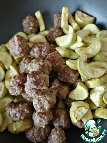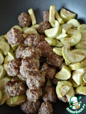 Сложить в глубокую сковороду кабачки и фрикадельки.