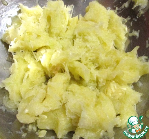 Очищенный кабачок нтереть на мелкой тёрке и оставить постоять, что бы сок вышел. После отжать до сухого. Но сок не выливать. Он потом понадобиться.