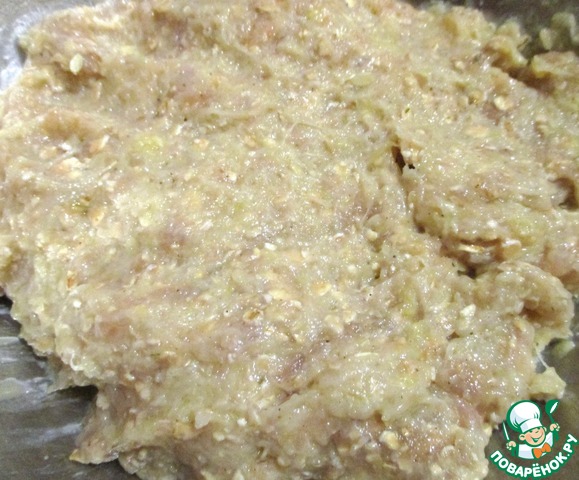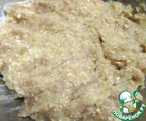 Смешать Филе с отжатым кабачком и понемногу добавлять сок от кабачка, доводя фарш до нужной консистенции. Не должно быть сухо или слишком жидко. Фарш как на котлеты должен быть.