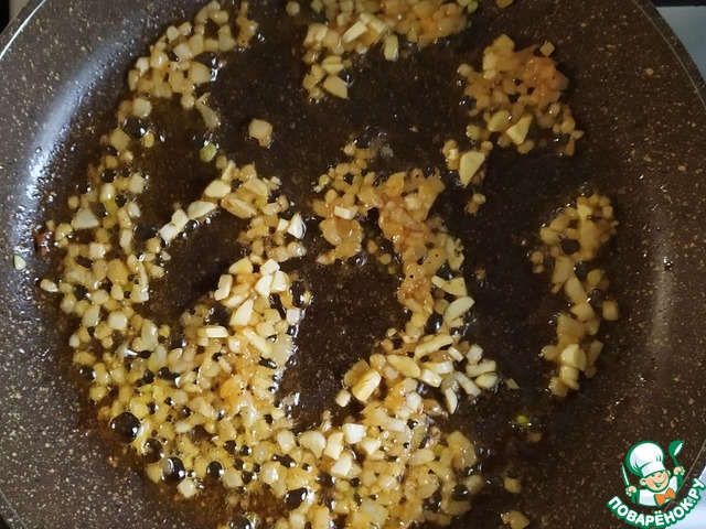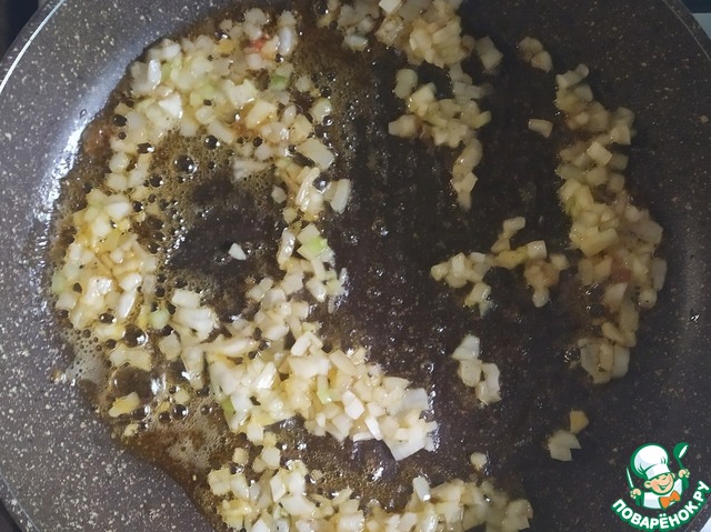 • В этой же сковороде растапливаем сливочное масло, добавляем оливковое. И обжариваем лук.