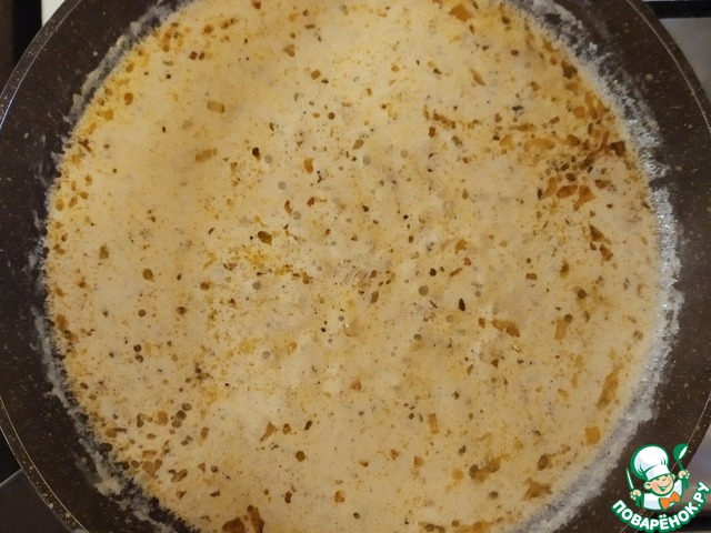 • Добавляем сливки. Солим, перчим, добавляем орегано и мускатный орех.