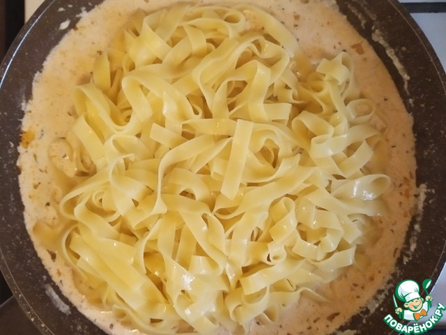 • Когда фетучини будут готовы, отливаем от них чашку воды и перекладываем к соусу, затем тщательно перемешиваем.