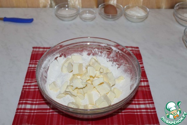 В просеянную муку добавляем холодное сливочное масло. Перетираем в крошку.