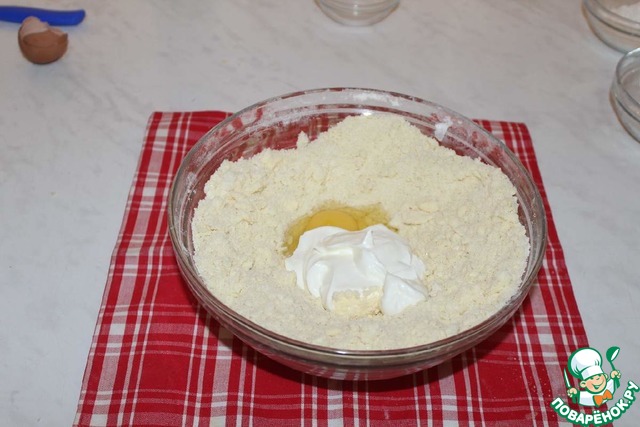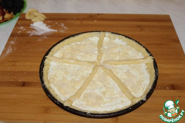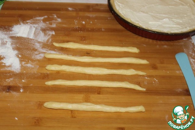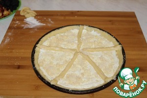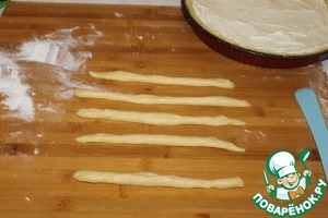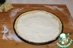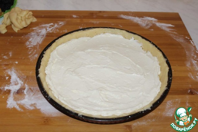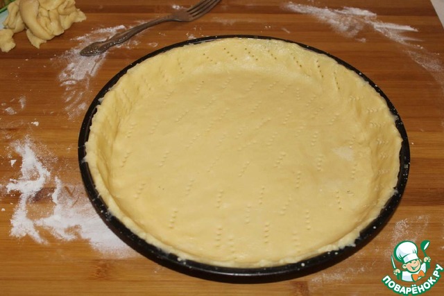 Раскатываем тесто в пласт. Выкладываем в форму, смазанную сливочным маслом. Перекладываем тесто в форму. Лишнее тесто по краям убираем. Делаем проколы вилкой.