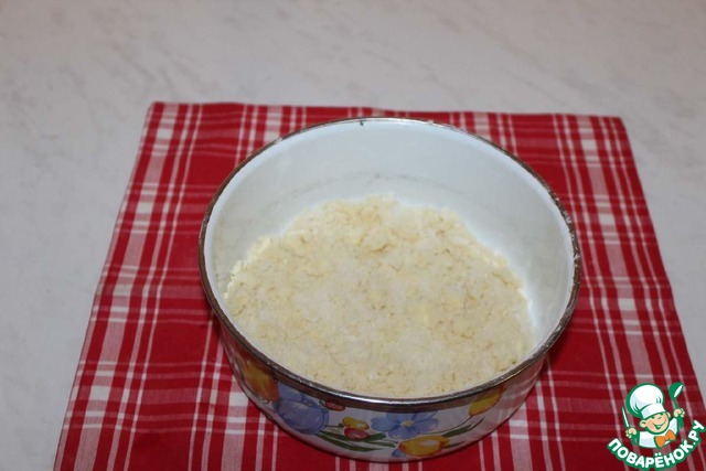 Готовим крошку. Смешиваем муку и сахар. Добавляем сливочное масло. Перетираем в крошку. Убираем в холодильник.