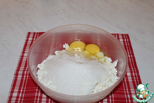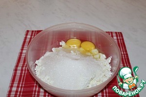 Готовим начинку. В творог добавляем сахар и яйца. Пробиваем до однородного состояния.
