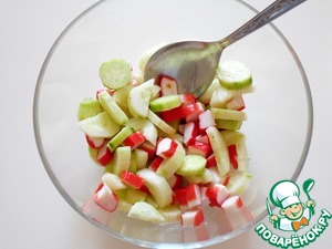 Тем временем нарезать на "шайбочки" в 5 - 7 мм крабовые палочки, я использую охлажденные, т. к. у замороженных другой вкус.