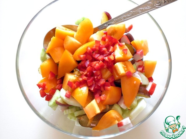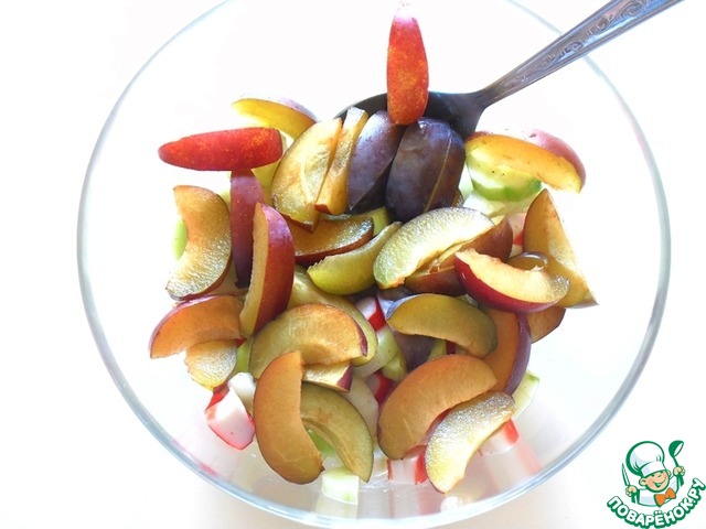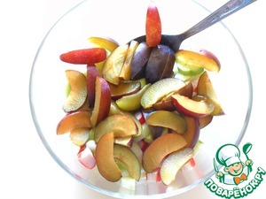 Освобожденные от косточек сливы нарезать на 6 - 8 долек, перемешать с содержимым миски.