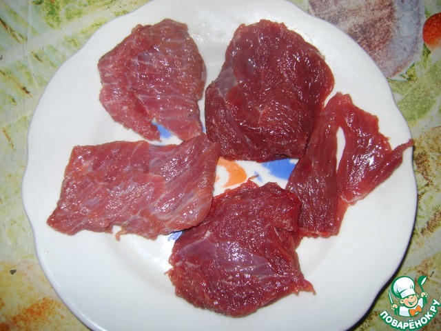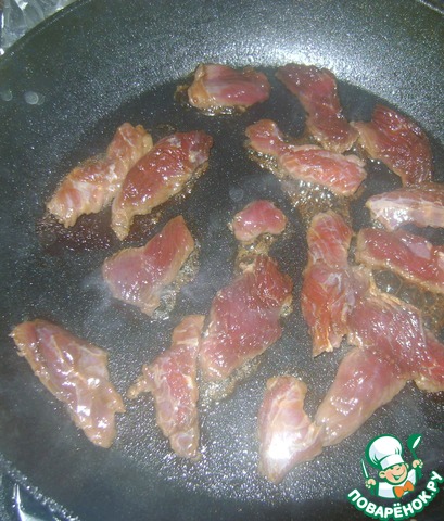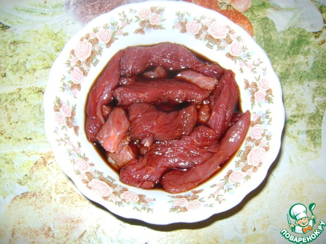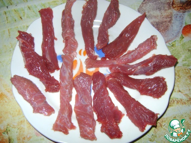 Мясо порезать на одинаковые полосочки. У меня это не особо получилось...