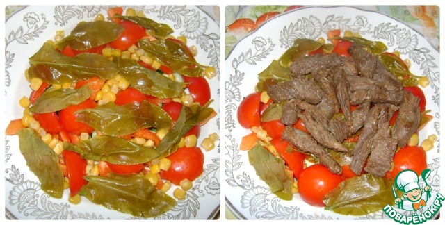 В наш будущий салат выкладываем листочки щавеля, а сверху распределяем остывшую говядину.