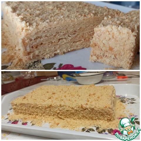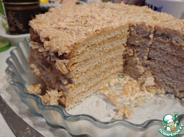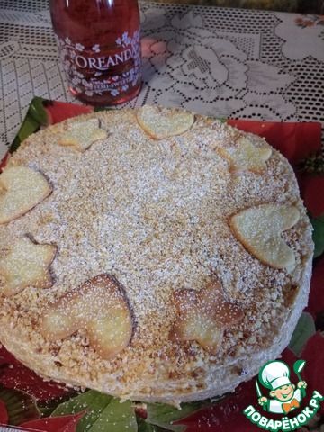 Делала половину порции. Очень интересный крем - масляный, но очень яблочный при этом. Пока яблоки уваривала, аромат по всех кухне шел божественный. Сейчас февраль, яблоки снежный кальвий, домашние, уже вялые. Получилось очень ароматно и с кислинкой. Но одной ночи для пропитки оказалось недостаточно (либо коржи пересушила, либо крем густоват, а может, так и должно быть).