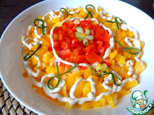 В завершении разложить по кругу желтый перец, не закрывая середину. В центре разместить красный перец. Нанести майонез. Оформить по желанию. Приятного аппетита!!!