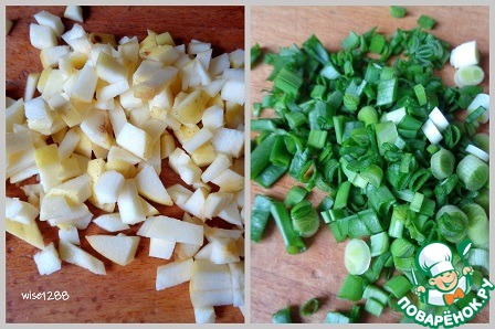 Яблоко порезать кубиком. Зеленый лук колечками.