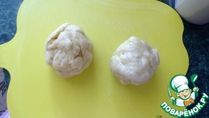 Смешиваем холодную воду с оливковым масло и солью. Взбиваем венчиком. Берем муку добавляем взбитую смесь и замешиваем тесто. У меня форма большая для такого количества теста (23d) поэтому я решила тесто сделать в двойной порции. Подготовленное тесто заворачиваем в пищевую пленку и отправляем в холодильник на минут 15-20. Получились вот такие небольшие шарики.