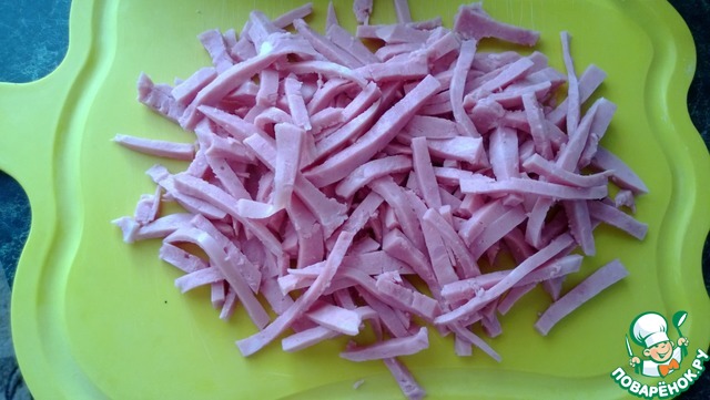Сверху на тесто выкладываем нарезанную ветчину, натертый сыр, листовой салат. Все хорошенько разравниваем и заливаем приготовленной заливкой. Отправляем пирог в разогретую до 180 гр. духовку и выпекаем 45 минут.