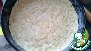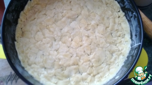 Форму для запекания смазываем, можно сливочным маслом, а можно маргарином и выкладываем приготовленное тесто. Делаем небольшие бортики (именно для бортиков пришлось сделать вторую порцию теста:))