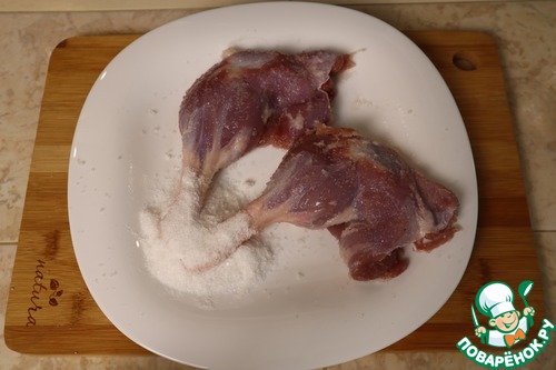 Через трое суток, достаём мясо из холодильника, стряхиваем соль с кости и заворачиваем в марлю.