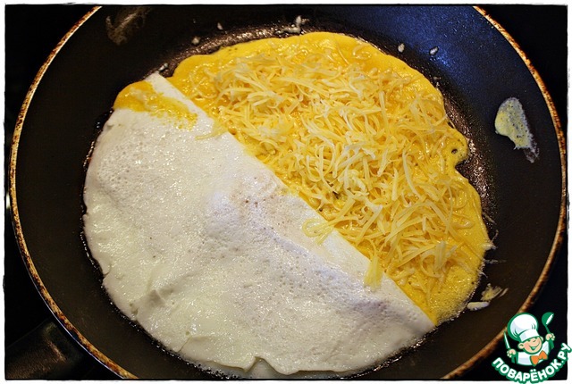 На пустую часть сковороды выливаем оставшийся белок, после схватывания посыпаем оставшейся частью сыра и накрываем половиной с начинкой.