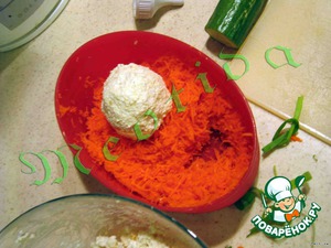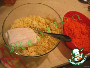 трем на мелкую терку морковочку, сыр, белки и чеснок