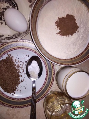 Подготовить ингредиенты для теста: просеянные муку пшеничные и какао - порошок, молоко свежее, соль, ванилин, разрыхлитель, потертые на средней терке 3 кубика от шоколадной плитки - шоколадную крошку, яйцо сырое, подсолнечное рафинированное масло, сахар (на фото не показан сахар, но добавляла обязательно 1 столовую полную ложку (можно 2)).