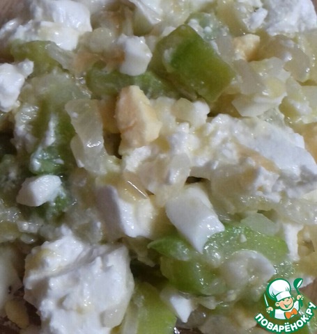 Кабачок очистить от кожи и семян, нарезать средними брусочками. Лук нашинковать полу кольцами и обжарить вместе с кабачком на растительном масле до золотистой корочки. Дать остыть.