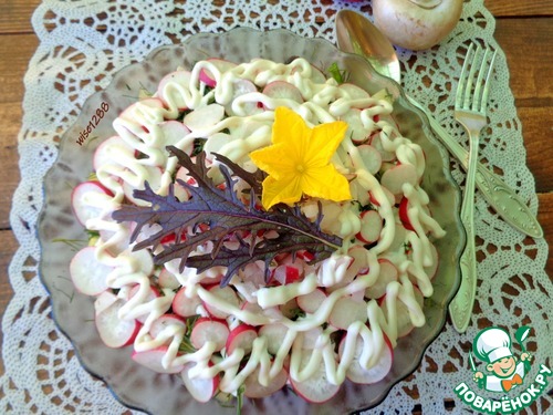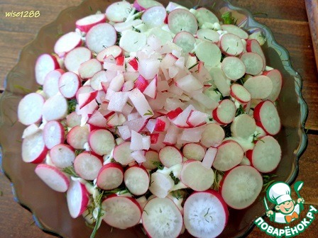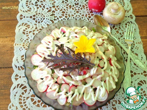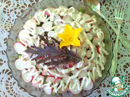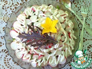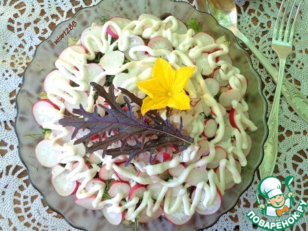 Верху разложить жаренные кабачки. Завершить салат редисом. По внешнему кругу разместить редис пластинками. В центр уложить редис, нарезанный мелко.