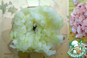 Репчатый лук и мясо порезать произвольно, посолить и пожарить на растительном масле до готовности.
