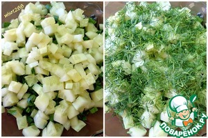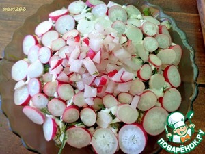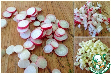 Две трети редиса нарезать пластинками, а остальную мелко. Огурец нарезать кубиками.