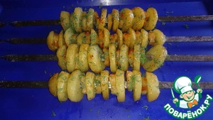 Кладём шампур с картошкой на фольгу, присыпаем чесноком и заворачиваем.
