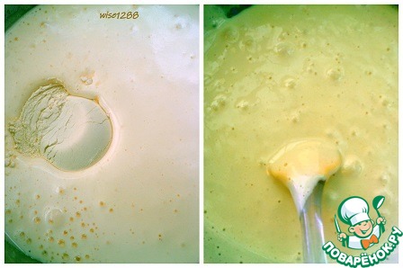 Разогреть духовку до 180 градусов. В яичную массу добавить муку, разрыхлитель, ванилин. Перемешать сверху вниз.