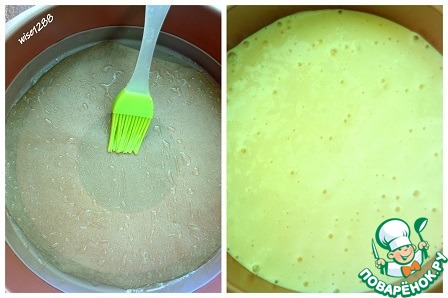 В разъёмное кулинарное кольцо уложить первую часть коржа, залить 1/3 крема. Повторить, тоже самое, со второй частью коржа и другой частью крема.