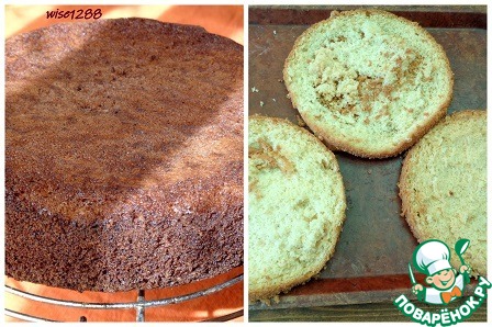 Выпекать при температуре 180 градусов 30 - 35 минут, до сухой деревянной шпажки. Остудить корж на решетке. Дать отдохнуть не менее четырёх часов. Разрезать вдоль на три части.