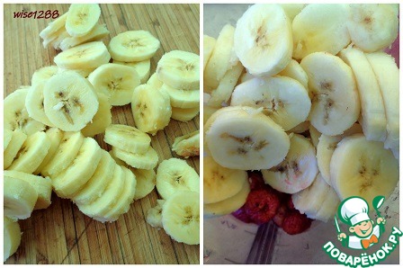 Подготовить крем: бананы нарезать. Поместить в чашу блендера малину и бананы.