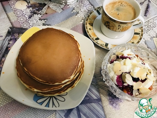 Панкейки можно подавать со сгущенкой, медом, джемом, ягодами или фруктами. Вкус у них потрясающий, обязательно попробуйте приготовить!