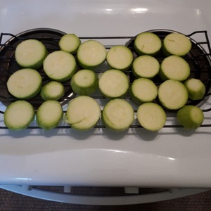 Кабачки нарезать на кружочки толщиной примерно 1 см. Запечь в духовке при t=200-220 гр.