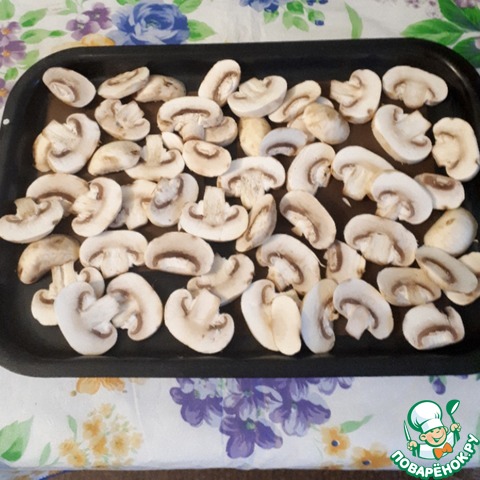 Грибы нарезать толщиной 5 мм, запечь в духовке при температуре 200-220 гр.. Цветную капусту разобрала на соцветия и тоже запекла в духовке.