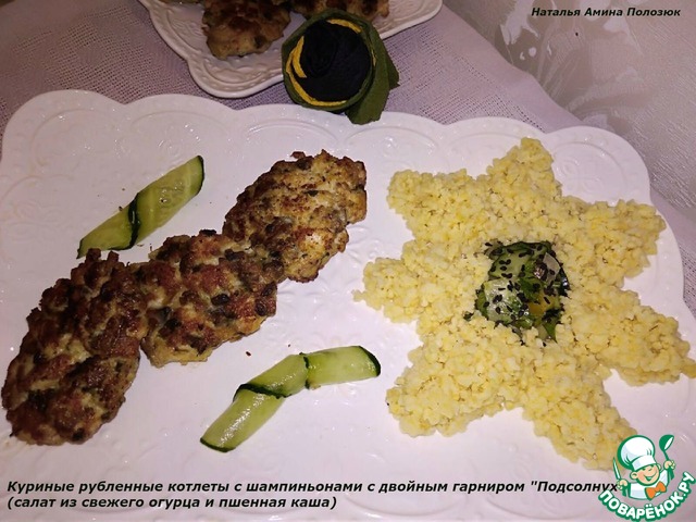 У кулинарных блогеров нынче в моде "простенькие" рубленные куриные котлеты... и у всех они разные. У меня для тех, кто любит шампиньоны и по желанию сладкий перец. Не случайно к этим котлеткам такой повышенный интерес - их можно кушать с любым гарниром или взять холодными на природу... а еще августовские подсолнухи навели меня на идею оформить "скучный" гарнир - пшенную кашу в виде "цветка солнца" (все цвета соблюдены: черный, желтый и зеленый) - ну чем не вкусный, съедобный подсолнух!