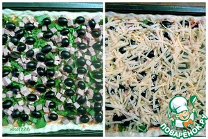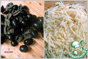 Оливки освободить от жидкости и порезать пополам. Сыр нашинковать.
