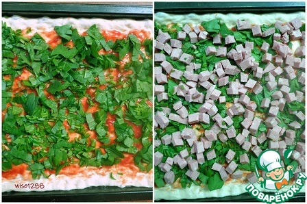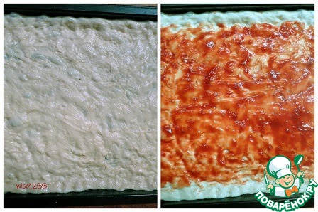 Включить духовку разогреваться до 180 градусов. Противень для выпекания смазать растительным маслом. Тесто распределить на противне. У меня размер противня 32 х 22 сантиметра. Смазать тесто томатной пастой.