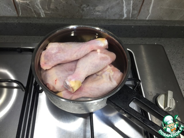 Отварить куриные ножки на среднем огне минут 30.