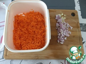 Нарезать лук, чеснок. Натереть на средней терке морковь.