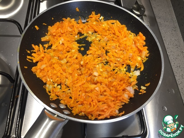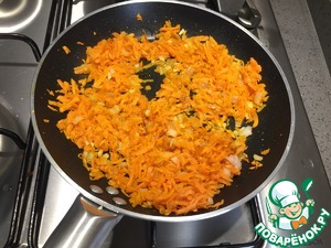 Обжарить лук, чеснок, морковь на оливковом масле до золотистого цвета.