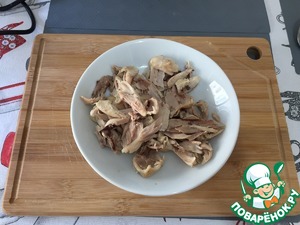 После приготовления куриных ножек, дайте мясу остыть и отделите его от костей.